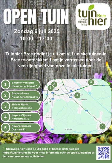 Op 6 juli 2025 organiseert Tuinhier Bree een bijzondere open tuin bij vijf van hun leden. Dit is een unieke gelegenheid om de prachtige tuinen in de stad Bree te ontdekken. Van 10:00 tot 17:00 uur heb je de kans om gratis te genieten van een diversiteit aan bloemen, planten en creaties die onze lokale tuinliefhebbers te bieden hebben.